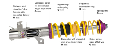 We also offer adjustable top mounts made from high tensile aluminum alloy for our KW Clubsport kits. Camber and caster (optional) adjustments are available on certain applications.